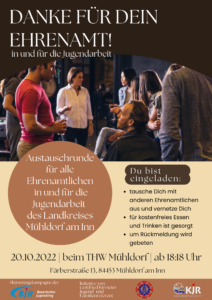 Der Kreisjugendring Mühldorf lädt am 26. November ab 17:00 Uhr alle ehrenamtlichen Helferinnen und Helfer ein, die den Kreisjugendring unterstützen bzw. unterstützt haben. Gemeinsam möchten wir mit euch ein weiteres erfolgreiches Jahr feiern und uns für den tollen Einsatz von jeder und jedem bedanken. Außerdem möchten wir den Anlass nutzen und bei gemeinsamem Essen, Trinken und Ratschen zu Jugendbegegnung einladen. Daher freuen wir uns natürlich auch über interessierte junge Menschen, die mit uns den gemeinsamen Abend verbringen wollen.