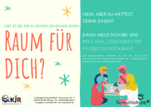 Hat deine Gemeinde einen Jugendraum, wo du dich mit Freund:innen treffen kannst und coole Aktionen stattfinden? Nein, aber du findest deine Gemeinde braucht so einen  Raum? Dann schreib uns doch einfach eine Nachricht per E-Mail an info@kjr-muehldorf.de oder auf Instagram/Facebook und sag uns, aus welcher Gemeinde du kommst!