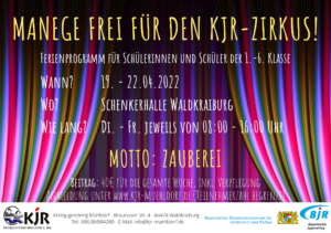 In den Osterferien heißt es für den Kreisjugendring Zirkus wieder „Manege frei“. „Hokus Pokus“ und „Abra Kadabra“, denn vom 19.04.-22.04.2022 bietet der KJR für Kids der 1.bis 6. Klasse eine ganztägige Ferienbetreuung von 08:00 bis 16:00 Uhr an.