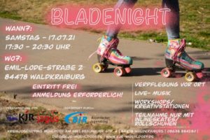 Am 17.07.2021 verwandeln sich drei Straßen in Waldkraiburg in eine kunterbunte Welt des Rollschuhfahrens. Der Kreisjugendring Mühldorf veranstaltet eine Blade Night. Eine Blade Night ist eine Veranstaltung auf Rollschuhen/Inline Skates. Dafür wird extra ein Rundkurs um den Kooperationspartner Projektehaus JAGUS gesperrt, sodass man sicher und entspannt über die Straße skaten kann. Mit Live Musik, Verpflegung, Kreativstationen und Workshops kann man hier den Abend auf Rollschuhen oder Inline Skates verbringen und es sich gut gehen lassen.