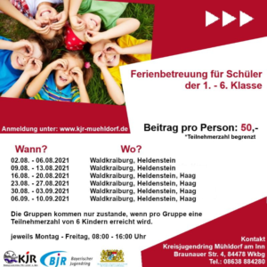 Im Auftrag des Bayerischen Staatsministeriums für Unterricht und Kultus koordiniert der Bayerische Jugendring in diesem Jahr erneut zusätzliche Angebote für Kinder und Jugendliche in den bayerischen Sommerferien. Somit bietet auch der Kreisjugendring Mühldorf eine Ferienbetreuung für alle Schülerinnen und Schüler von der 1. – 6. Klasse an.
