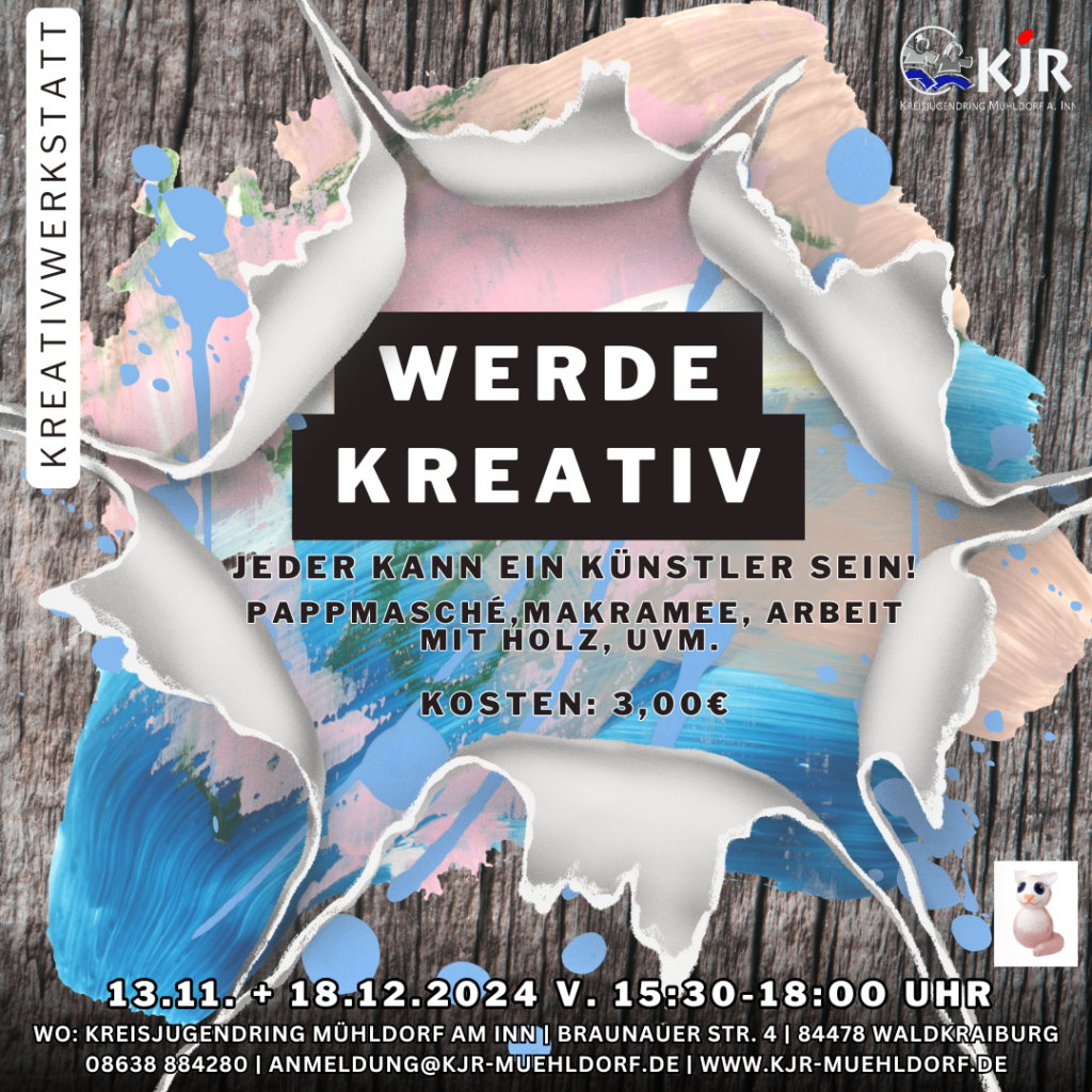 Hast du Lust mal was Neues, Kreatives auszuprobieren? In unserer Kreativwerkstatt stehen die Türen offen, damit du dich kreativ austoben kannst. Gemeinsam mit unserer ehrenamtlichen Betreuerin Claudia hast du noch dieses Jahr die Möglichkeit dich an zwei Terminen noch künstlerisch auszuprobieren.